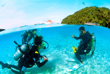 ボートでロックアイランドまで移動して、ビーチでの体験ダイビング。(1名様から催行)